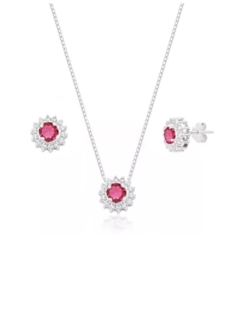 Conjunto redondo com pedra central rosa e bordas cravejadas.
